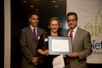 Odyssey House President & CEO Peter Provet (right) accepting the 2009 “Outstanding Residence of the Year” award from SHNNY Executive Director Ted Houghton (left) and SHNNY Steering Committee Chair Carole Gordon (center).